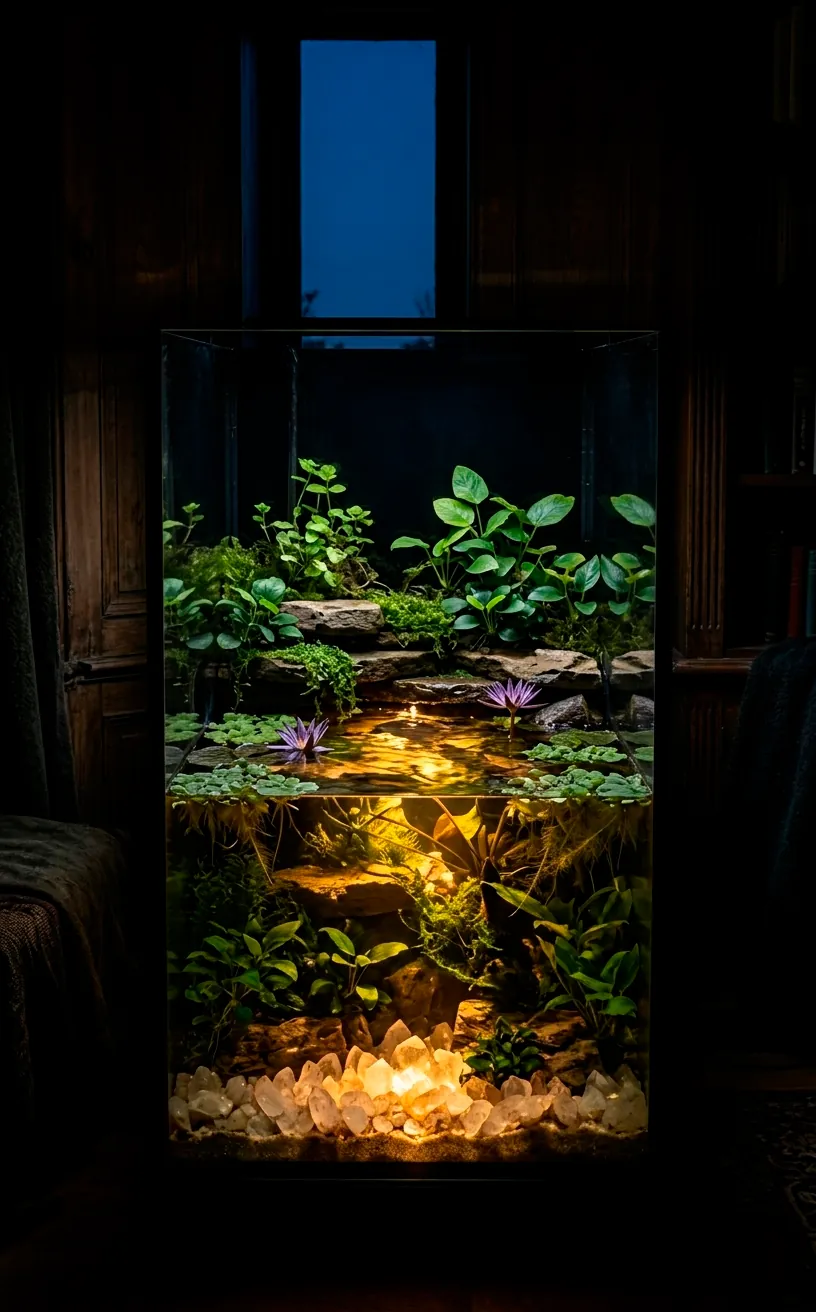 You can also hide a small LED puck light behind a rock to create a glowing effect at night. It looks absolutely magical when the room is dark. I often add a few crystals or unique stones to the bottom to reflect the light and add a personal touch.