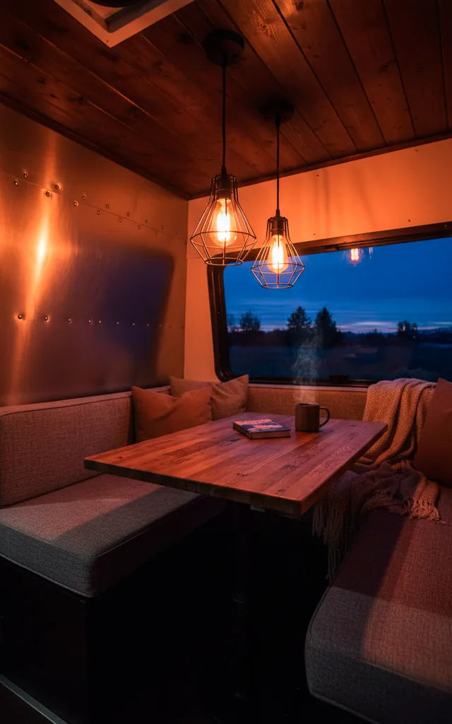 Lighting changes everything in a metal-heavy space. I swear by Edison bulbs and cage pendants to hammer home that factory look. Avoid those clinical, bright white LEDs that make your van feel like an operating room. Warm, amber light reflecting off a steel backsplash creates a mood you won’t want to leave. FYI, dimmers are your best friend here. Want a romantic evening or a workspace? You get both with the right bulbs.
