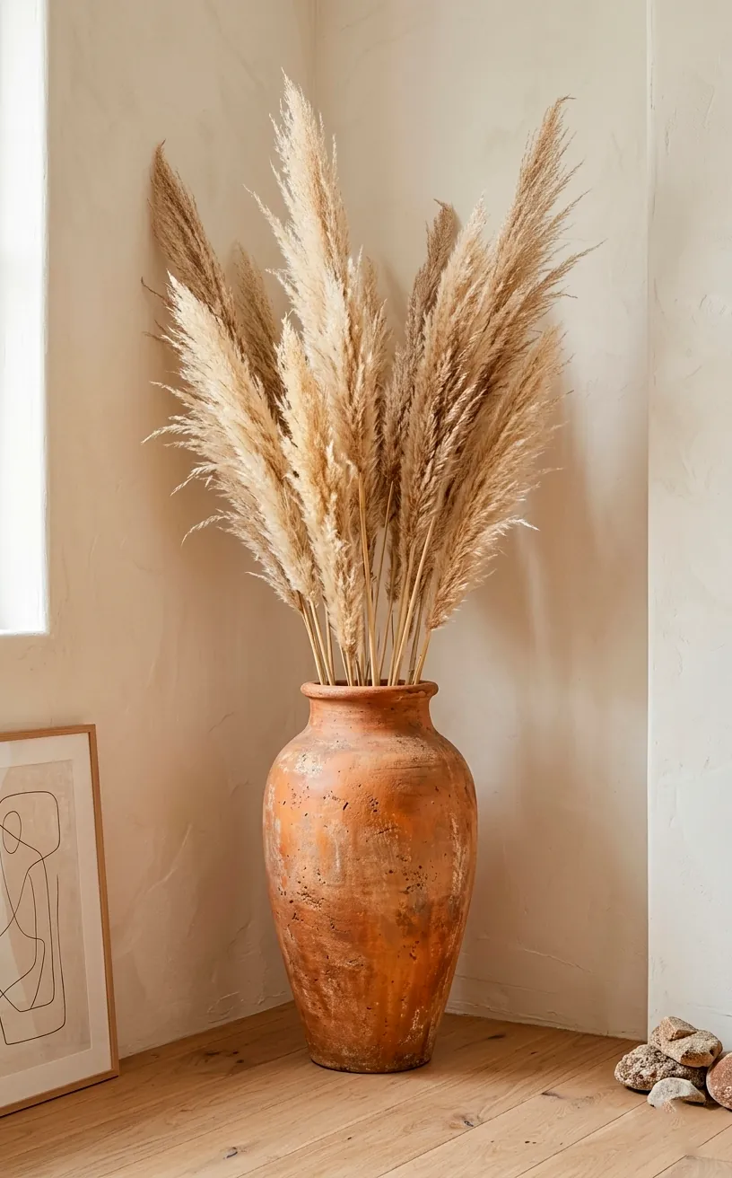 Bring the outside in without the actual bugs, obviously. Dried pampas grass, wheat stalks, or even some crusty branches from the yard add an organic texture that synthetic materials just can’t mimic. I’m a huge fan of stuffing a weathered terracotta vase with tall, dried foliage to give the room some height and a bit of that ‘haunted forest but make it chic’ energy. For more ideas on keeping things grounded, check out these minimalist living room cozy tips to balance your autumn abundance.