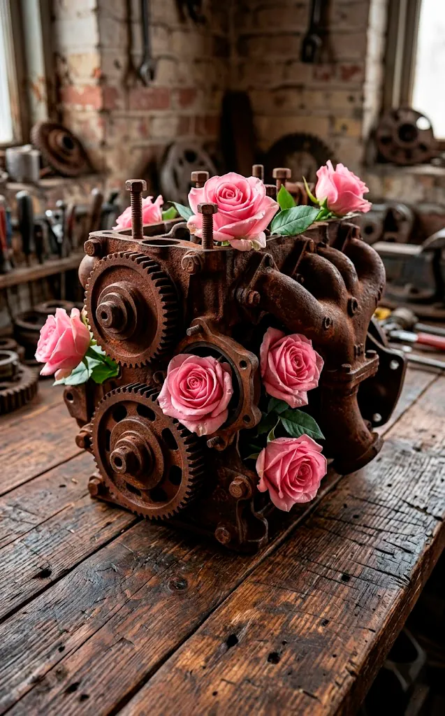 Forget the crystal vases your grandma loves. To master this style, look for items that weren’t originally meant for flowers. I’m talking vintage oil cans, iron pulleys, or heavy-duty copper pipes. The contrast here is key; the more work-worn the vessel looks, the more the delicacy of the rose shines through.
