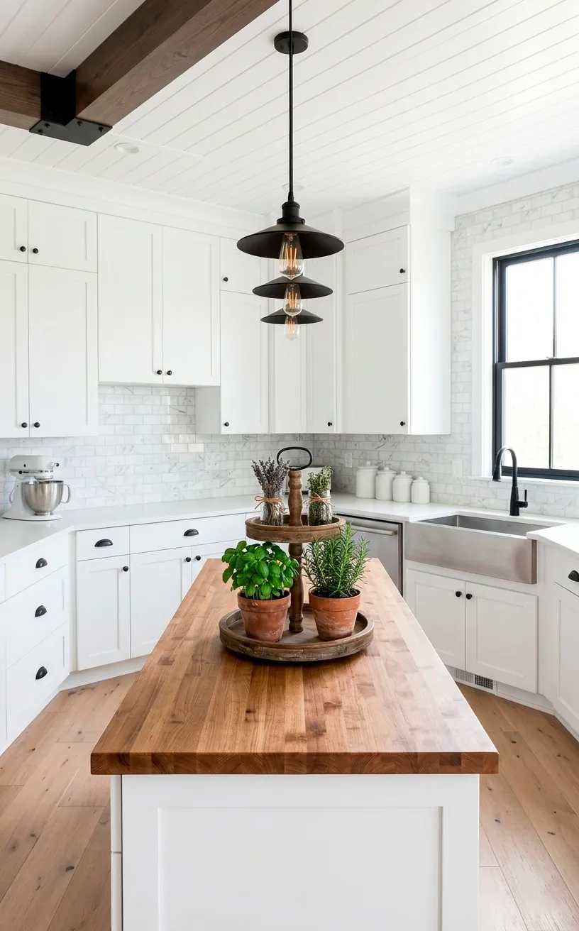 The kitchen is the heart of the home, but it’s also where ‘farmhouse’ can quickly turn into ‘cluttered antique shop.’ Keep it simple with a tiered wooden tray on the island. I fill mine with small terracotta pots of herbs like rosemary and mint. My herbs have a 50% survival rate, but they look great for the first week!