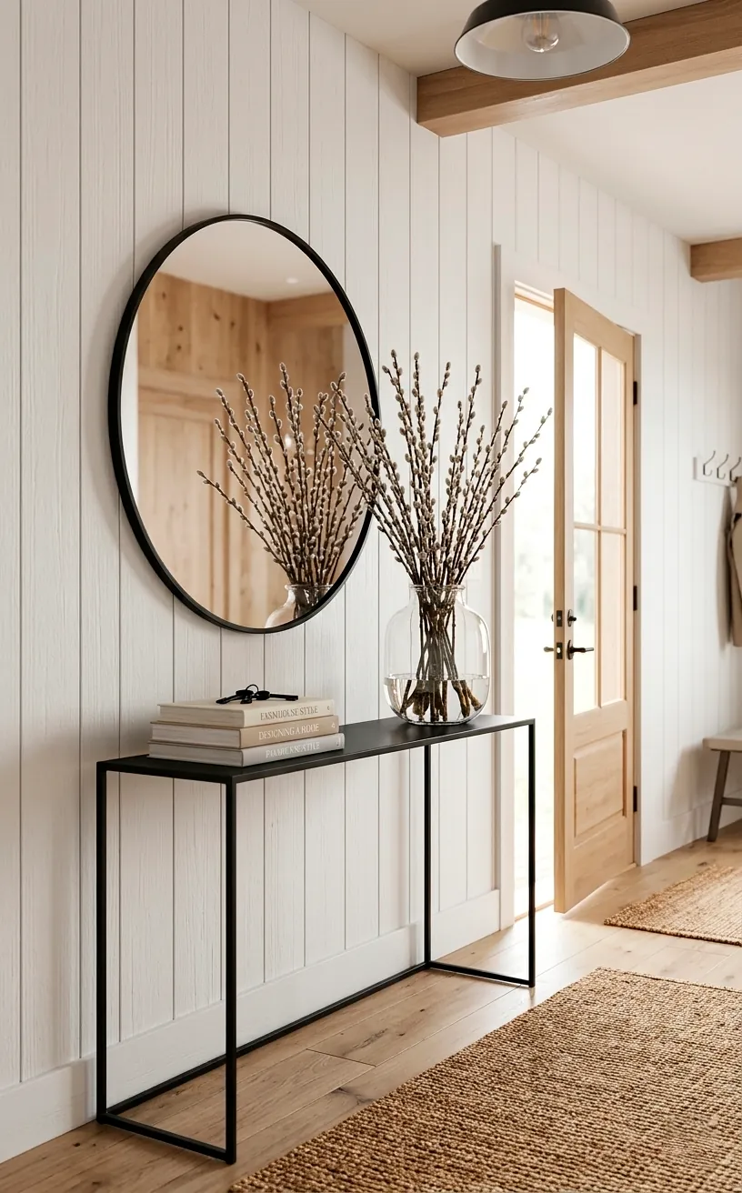 Your entryway is the first thing people see, so why let it look like a cluttered crime scene for muddy boots? I love using a simple black console table to ground the space. It’s sleek, it’s modern, and it doesn’t scream ‘I live in a barn’ too loudly. Throw a tall glass vase filled with fresh pussy willow branches on there, and you’ve basically mastered the season. Who knew sticks could look so fancy?