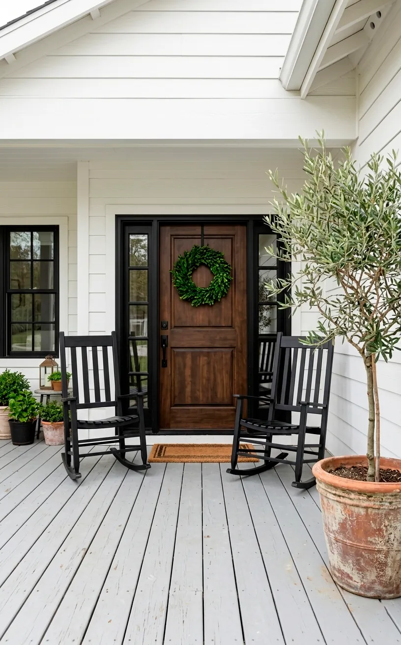 Finally, take the vibe outside! A modern farmhouse porch needs a pair of matte black rocking chairs and a simple olive tree in a terracotta pot. I skip the overly floral wreaths and go for something leafy and green instead. It looks sophisticated and stays relevant long after the first tulips bloom. Ever noticed how a clean porch makes the whole house look more expensive? It’s basically magic. 🌿