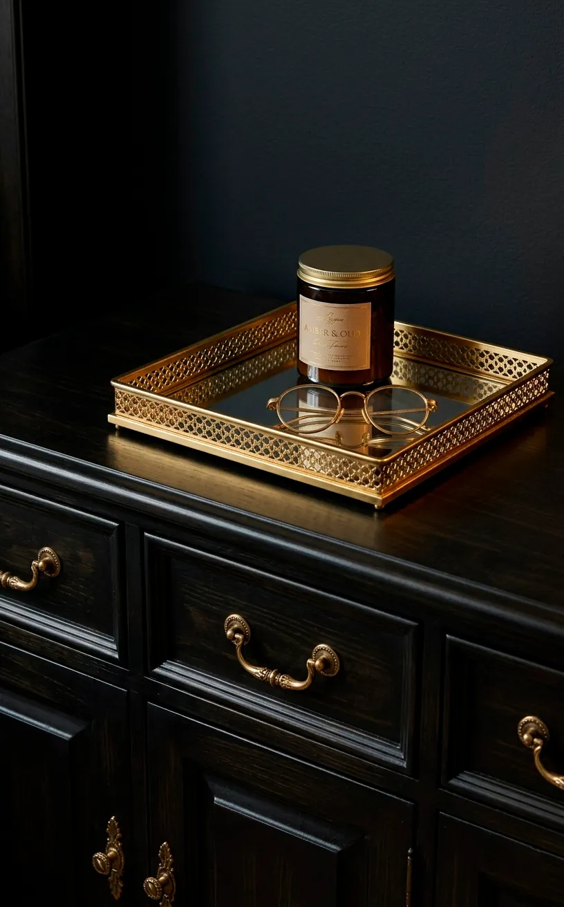 These metallic touches reflect light back into the room, creating tiny focal points that guide the eye. It breaks up the darkness and adds a sense of luxury that silver or chrome often lacks in a moody setting. Keep the metals consistent to ensure the room feels cohesive rather than chaotic.