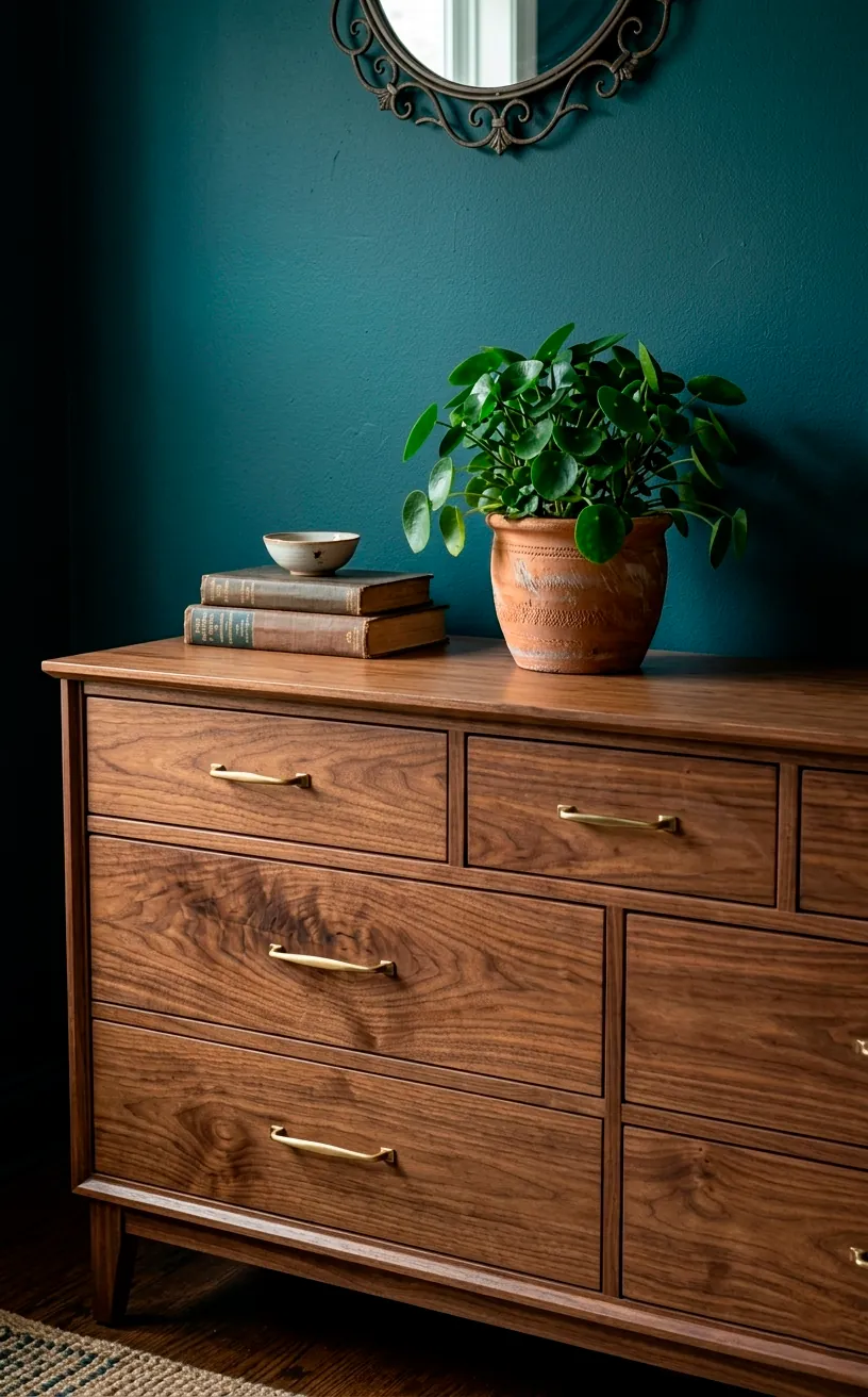 Natural wood tones are your best friend in a moody space. Mid-century modern walnut or even a light oak prevents the room from feeling like a black hole. I love how a warm wood grain stands out against a deep forest green or plum. It brings a bit of nature indoors, which balances out the drama perfectly. Don’t be afraid of a little contrast! A light-colored wood dresser or a rattan headboard can provide just enough ‘breath’ to keep the vibe relaxed and approachable rather than stiff and formal.
