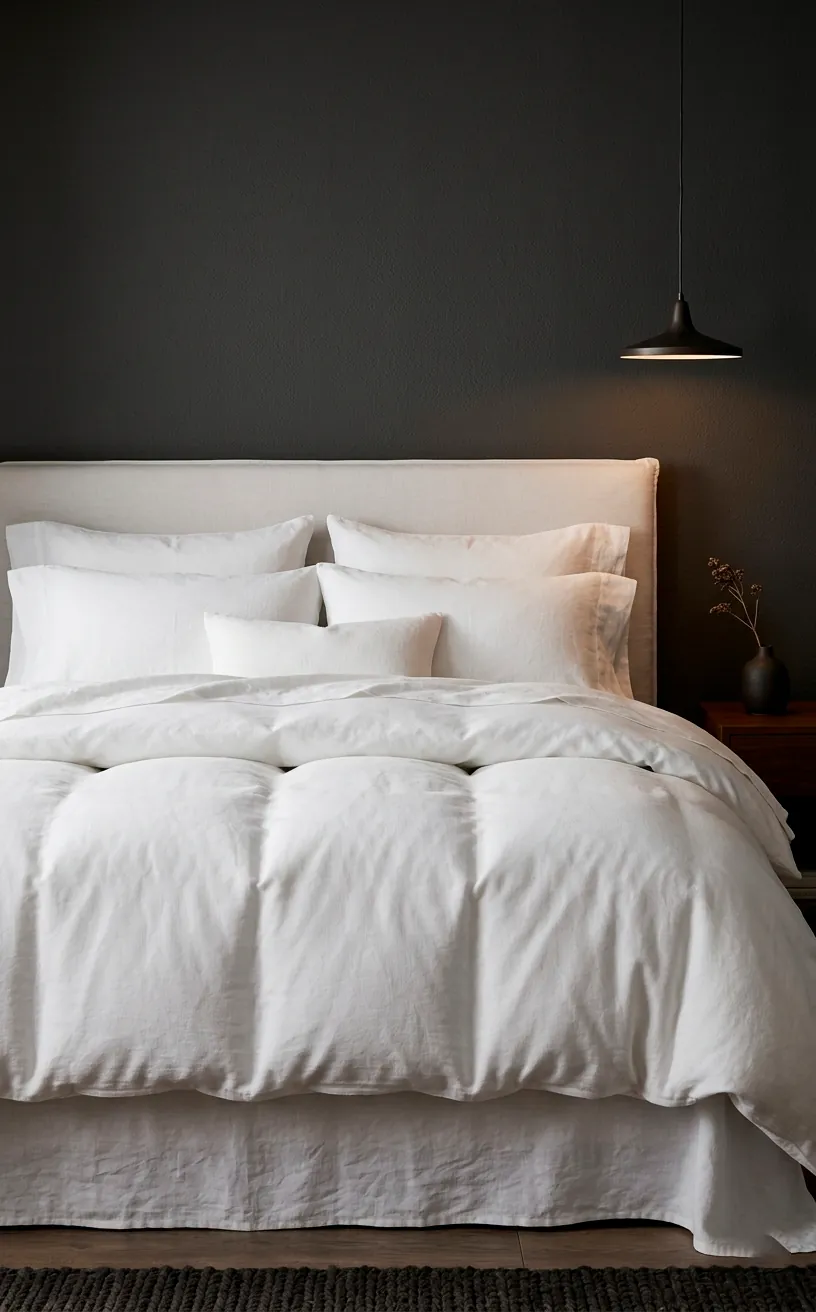 Your bed is the centerpiece, so don’t let it get lost in the shadows. Crisp white linens provide a sharp contrast that looks incredibly clean and inviting against dark walls. It’s the classic ‘hotel’ look that never fails.