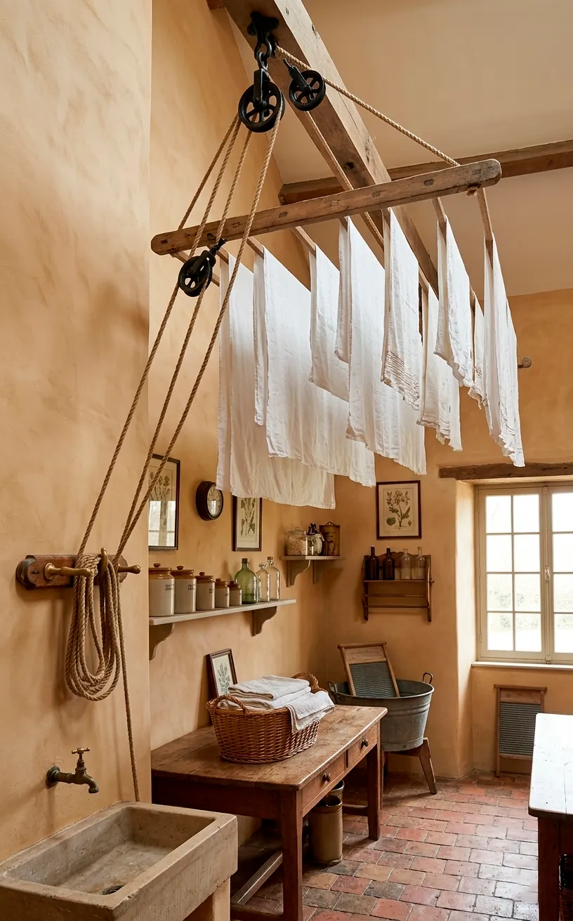 If you’re still wrestling with one of those flimsy plastic folding racks that collapses if you look at it wrong, we need to talk. A wooden pulley-style drying rack is the ultimate game-changer for old-soul homes. I think the ritual of hoisting your damp linens up toward the warm air near the ceiling is oddly satisfying. It keeps the floor clear, looks like something straight out of a Victorian scullery, and saves a ton of space in smaller rooms. Plus, it gives you that perfect excuse to buy some high-quality wooden clothespins that don’t snap the second you use them. Will it make the dryer stop eating your socks? Probably not, but at least your air-drying game will look professional.