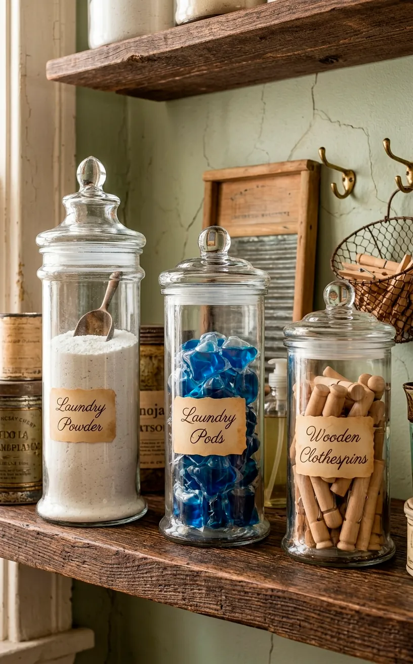 Why keep your detergent in a clunky, colorful cardboard box when you can store it in oversized glass apothecary jars? It’s one of those small changes that feels incredibly high-end but costs very little. I love seeing the layers of white powder or colorful scent beads through the glass; it’s oddly calming. I usually pair mine with a vintage silver or wooden scoop to keep things looking authentic. Just be sure to label them clearly if you have kids around—safety first, even in a curated aesthetic. It turns your everyday supplies into a decorative display that you won’t want to hide behind a cabinet door.