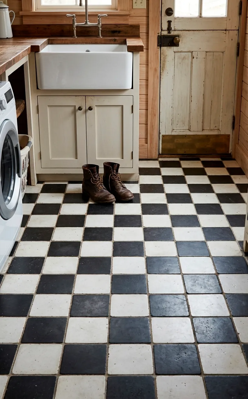 Nothing screams ‘vintage utility’ quite like a black and white checkerboard floor. It’s a classic for a reason—it’s bold, it’s timeless, and it hides a surprising amount of lint. If a full checkerboard feels too intense for your space, I highly recommend looking into white penny tiles with dark grout.