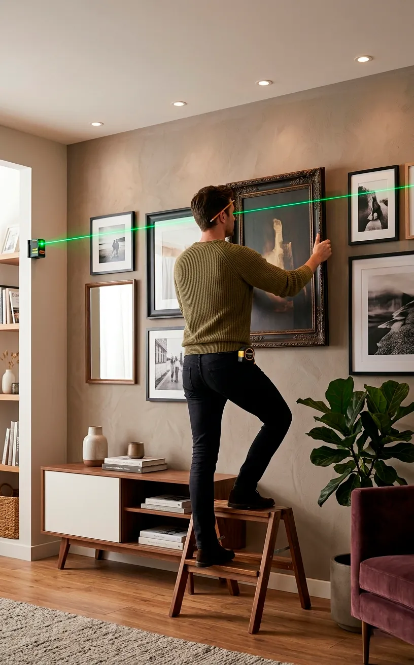 This is where the magic happens. Use a laser level because eyeballing it is a recipe for disaster and a crooked neck. I love using command strips to avoid permanent damage, especially if you’re renting. Ever noticed how a perfectly straight line makes even the weirdest art look curated? Keep a consistent gap between your frames for that professional finish. It looks tight, clean, and intentional. 🙂 Your future self will thank you for the extra effort.