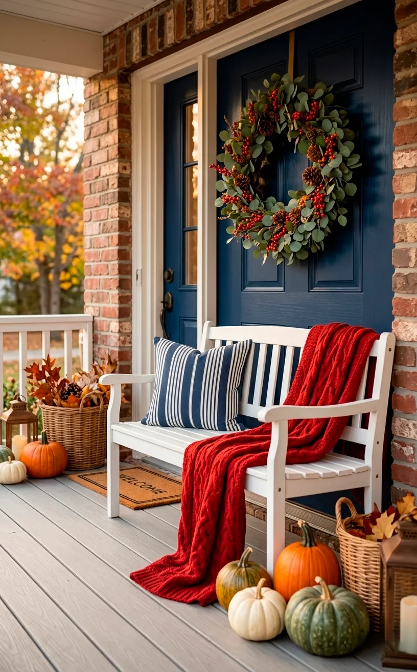 Modern wreaths with eucalyptus and red berries bridge the gap between seasonal and permanent decor perfectly. You don’t need to hang a giant flag to show your style; subtle touches like a blue-and-white striped rug do the trick. Is there anything better than a porch that feels like an extension of your living room? I don’t think so. It creates a seamless transition that guests will notice immediately.