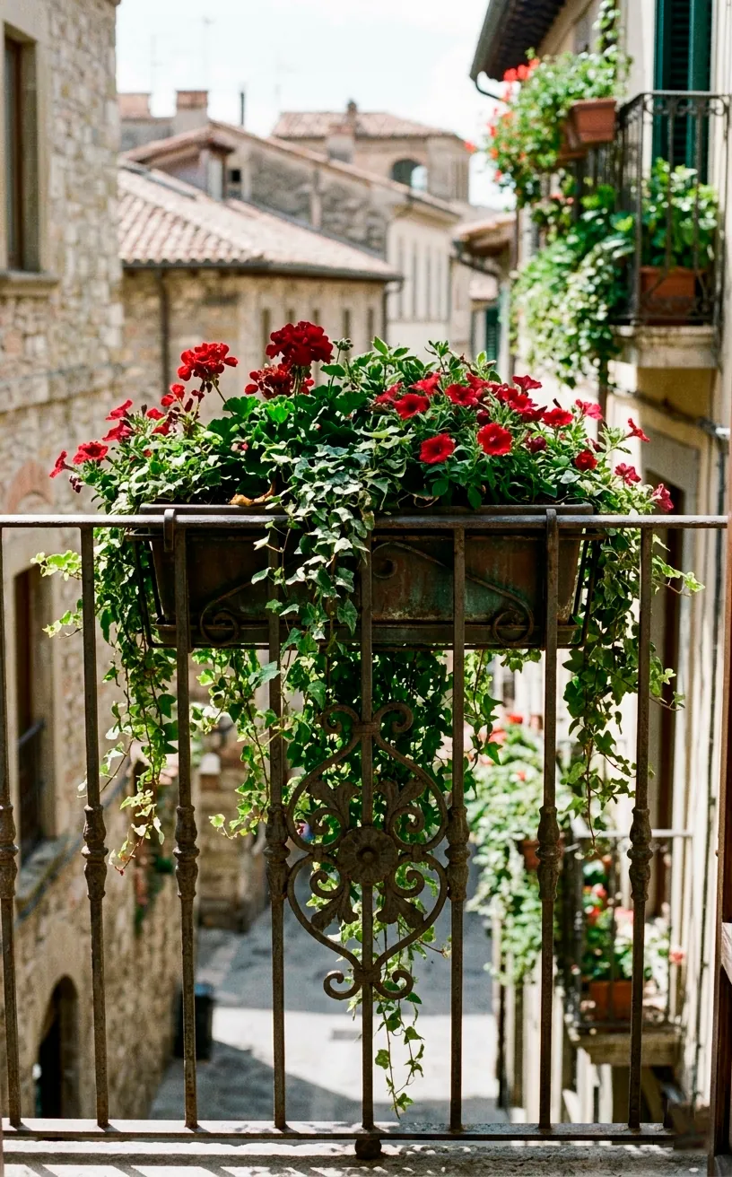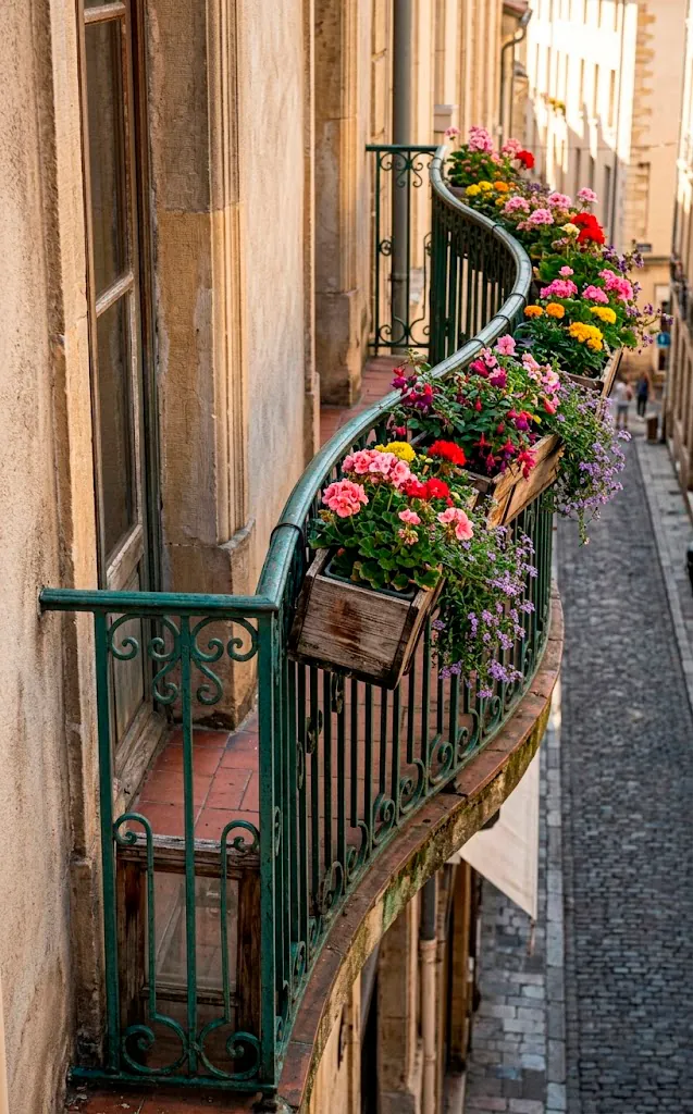 You can’t have a French balcony without geraniums. Integrated brackets let you hang heavy iron or wooden planters directly onto the railing without ugly plastic hooks.