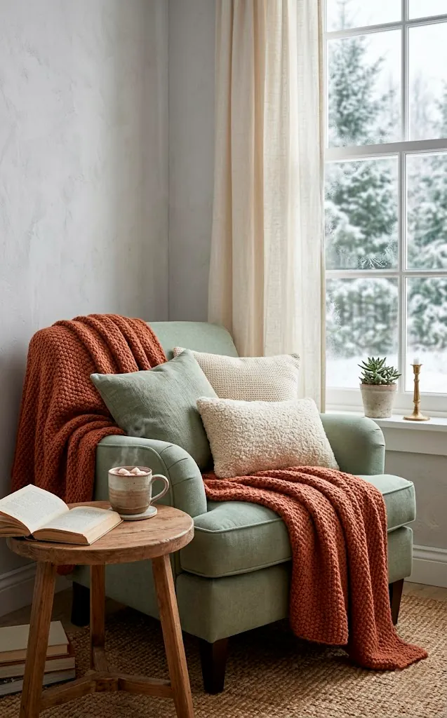 Coziness isn’t just a feeling; it’s a strategy. I firmly believe you can never have too many blankets. For 2026, we’re ditching the scratchy wool tartans for chunky knit throws in sage and velvet pillows in terracotta. This combo feels incredibly lush and expensive.