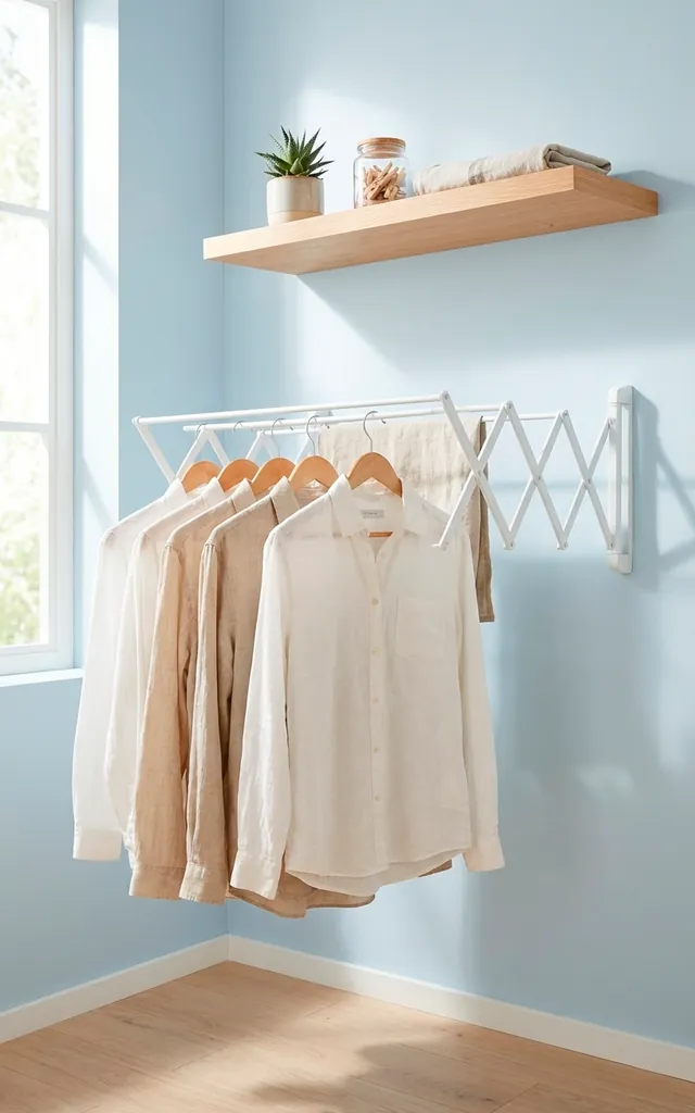 Clunky floor drying racks are the ultimate enemy of a small space. I replaced mine with a wall-mounted folding rack years ago and never looked back. These gems disappear against the wall when you don’t need them. Use a sleek accordion style or a pull-down wooden frame to maintain that clean aesthetic. Why trip over metal legs when your walls offer free real estate? It saves your shins and your sanity.