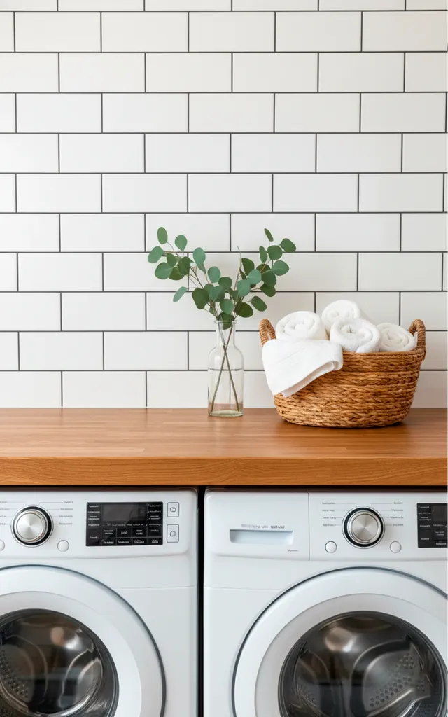 You need a place to fold, but a dedicated table usually won’t fit. I love installing a butcher block countertop directly over front-loading machines. This creates a seamless, sturdy surface for sorting socks or pretreating stains. It also prevents those pesky socks from getting lost behind the dryer. Plus, the wood grain adds a warm, organic touch to an otherwise sterile space. Isn’t a smooth, wide surface basically a luxury in a closet-sized room?