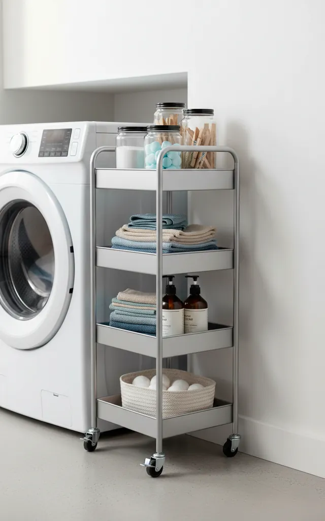 Clutter kills the vibe of a high-functioning nook. I hide my supplies in rolling slim carts that slide between the machines and the wall. These ‘gap fillers’ hold your detergent, dryer sheets, and stain sticks out of sight. You can also use wicker baskets on high shelves to keep the ‘ugly’ stuff hidden. It maintains a Pinterest-worthy look without sacrificing accessibility. Ever felt that rush of joy when everything has a specific home? It’s addictive.