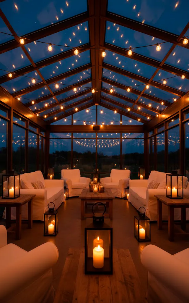 Why let your sunroom go dark just because the sun went down? I think people forget that sunrooms need an evening personality too. Skip the harsh overhead lights and opt for something moodier. String lights across the ceiling beams or place a few oversized lanterns on the floor for a soft, flickering glow. I personally use smart bulbs so I can dim the lights from my phone when it’s time for a glass of wine. 🙂 It turns the space from a daytime sun-trap into a magical twilight escape. Who doesn’t love a bit of evening ambiance?