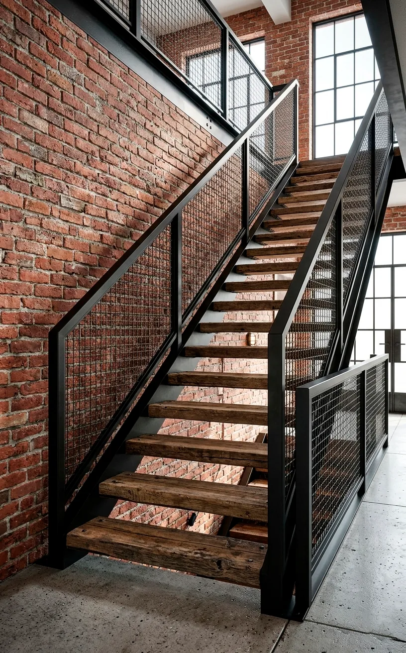If you like that reclaimed warehouse look, industrial stairs are calling your name. We’re talking black steel frames, mesh panels, and distressed wood. It’s rugged, durable, and honestly looks cooler than anything else on the market. Do you really want something delicate when you can have something that looks like it survived the industrial revolution? FYI, these are incredibly easy to clean. A quick wipe and you’re done. No more vacuuming individual steps! They bring a raw, honest energy to any open-plan living space.