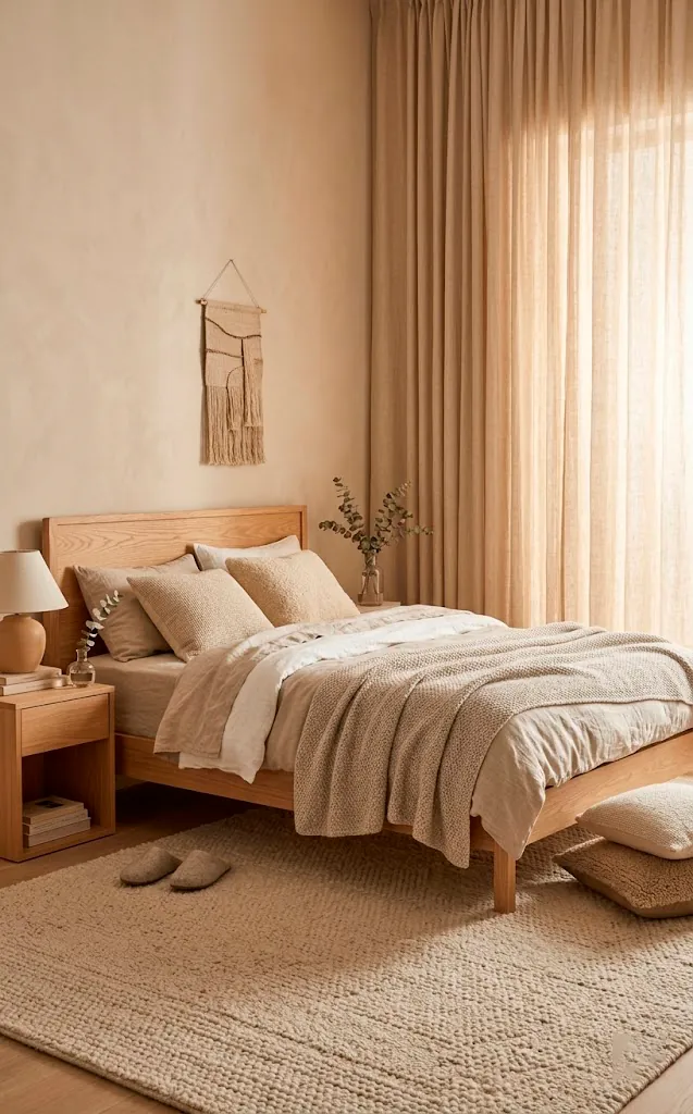 Hygge loves nature, but like, the clean version. Bring in raw wood elements to ground the space. A light oak headboard or a cedar chest adds warmth that paint just can’t touch.