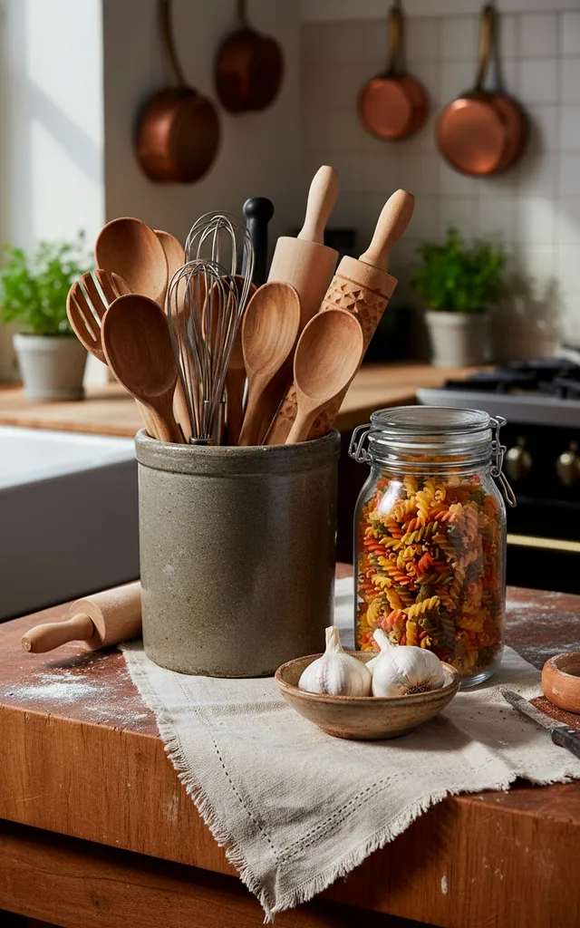 IMO, a kitchen that is too clean feels suspicious. Cottagecore thrives on ‘curated chaos,’ where every object has a purpose or a memory. Keep your wooden spoons in an oversized ceramic crock and leave your linen bread bags out on the counter. I find that displaying your everyday tools makes cooking feel less like a chore and more like an art form. Arrange your spice jars in a wooden rack where you can actually see them. Just ensure every piece of ‘clutter’ brings you joy rather than stress. Life is too short for empty counters.