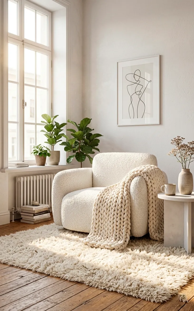 Do you ever feel like white rooms lack soul? People often fear that an all-white palette feels clinical. I fix this by layering diverse textures that catch the light differently. I mix a chunky knit white throw with a sleek white boucle chair to create visual depth without adding brain-cluttering ‘noise.’ Why does this work? It keeps the eye moving without needing loud colors. I personally love tossing a white faux fur rug over a light floor to ground the space. FYI, these subtle shifts in material create a cozy, lived-in vibe that still feels incredibly fresh and open. 🛋️