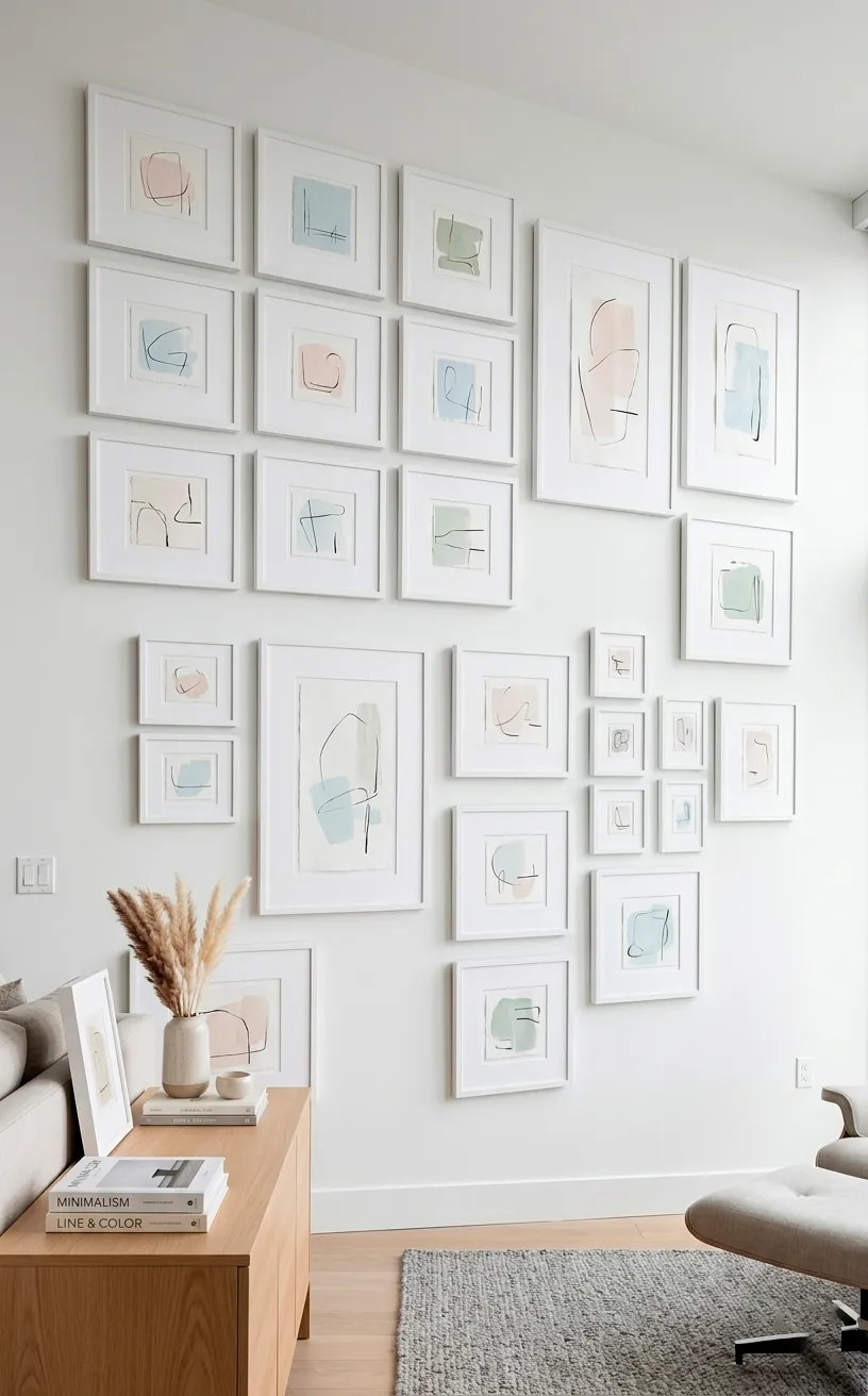 Huge, dark paintings can overwhelm a tiny wall and make the room feel cramped. Instead, I choose art with thick white matting and simple white frames. This creates a ‘buffer’ of brightness around the artwork, making the wall feel expansive rather than cluttered. Even if the art itself has color, the white border keeps the overall vibe airy. I’ve found that a gallery wall of smaller pieces with massive mats actually looks much more expensive and ‘designed’ than one giant canvas. It’s all about giving your eyes a place to rest.